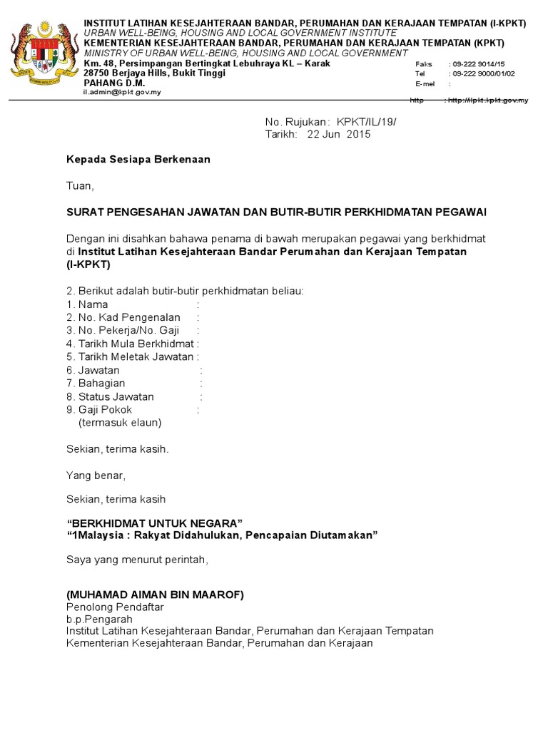 BERIKUT ADALAH CONTOH SURAT PERJANJIAN JUAL BELI TANAH. Tuan SURAT PENGESAHAN JAWATAN DAN BUTIR-BUTIR PERKHIDMATAN. Untuk membuat pinjaman bank pinjaman perumahan RUMAWIP sambung belajar buka akaun bank dan banyak lagi.